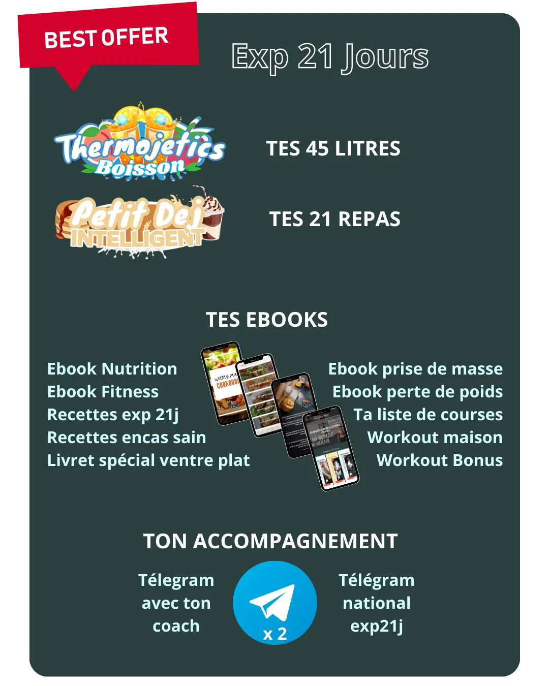 Nous sommes là pour t'accompagner pour démarrer ta transformation, et opter pour l'expérience de 21 jours est une excellente décision ! Tu bénéficieras de la motivation des autres participants, de conseils nutritionnels, de séances de sport en vidéos, de groupes de discussion, et surtout, d'une hydratation optimale et d'un petit déjeuner intelligent pour parfaire ton parcours !